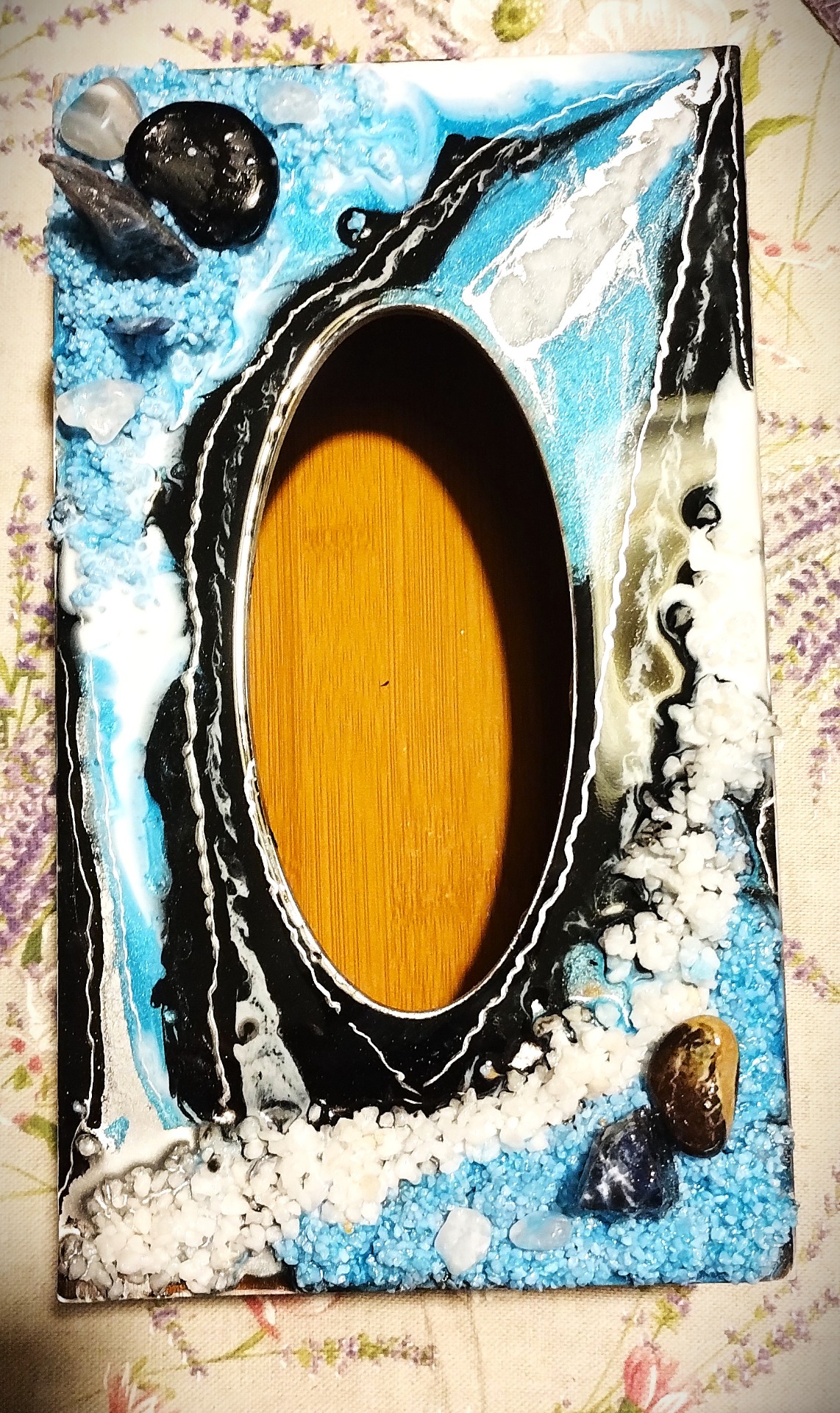 Dřevěná krabice s vysouvacím dnem. Rozměry 26x9x15 cm. Vrchní díl je ozdoben epoxidovou pryskyřicí dekoračními prvky a polodrahokamy. Zde je použit Lapis lazuli, achát, křišťál a turmalín.