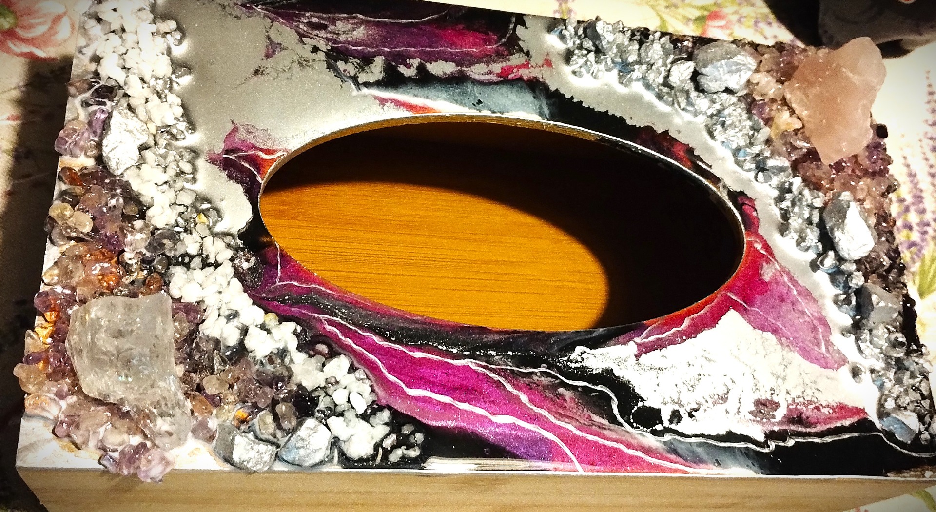 Dřevěná krabice s vysouvacím dnem. Rozměry 26x9x15 cm. Vrchní díl je ozdoben epoxidovou pryskyřicí dekoračními prvky a polodrahokamy. Zde je použit křišťál, ametyst a růženín.